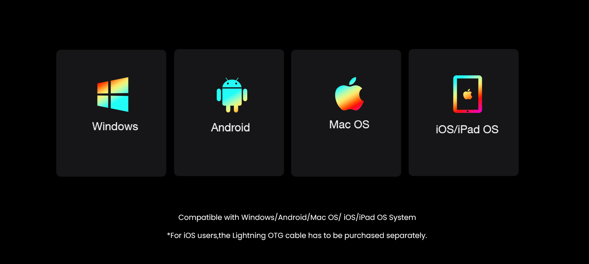| System Function | Support: Windows, Mac OS, iPad OS, Android, iOS. Please note: For iOS users, the Lightning OTG cable has to be purchased separately. |