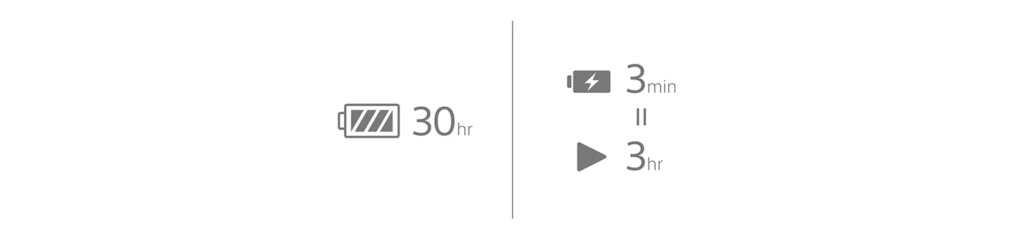 Bạn cần tiếp tục nghe khi pin yếu? Chỉ cần cắm cáp sạc USB và tiếp tục nghe. Hỗ trợ cả kết nối Bluetooth và cáp âm thanh. Bạn thậm chí có thể sạc nhanh hơn khi tắt tai nghe—chỉ cần 3 phút là tai nghe có thể phát lại trong 1 giờ.