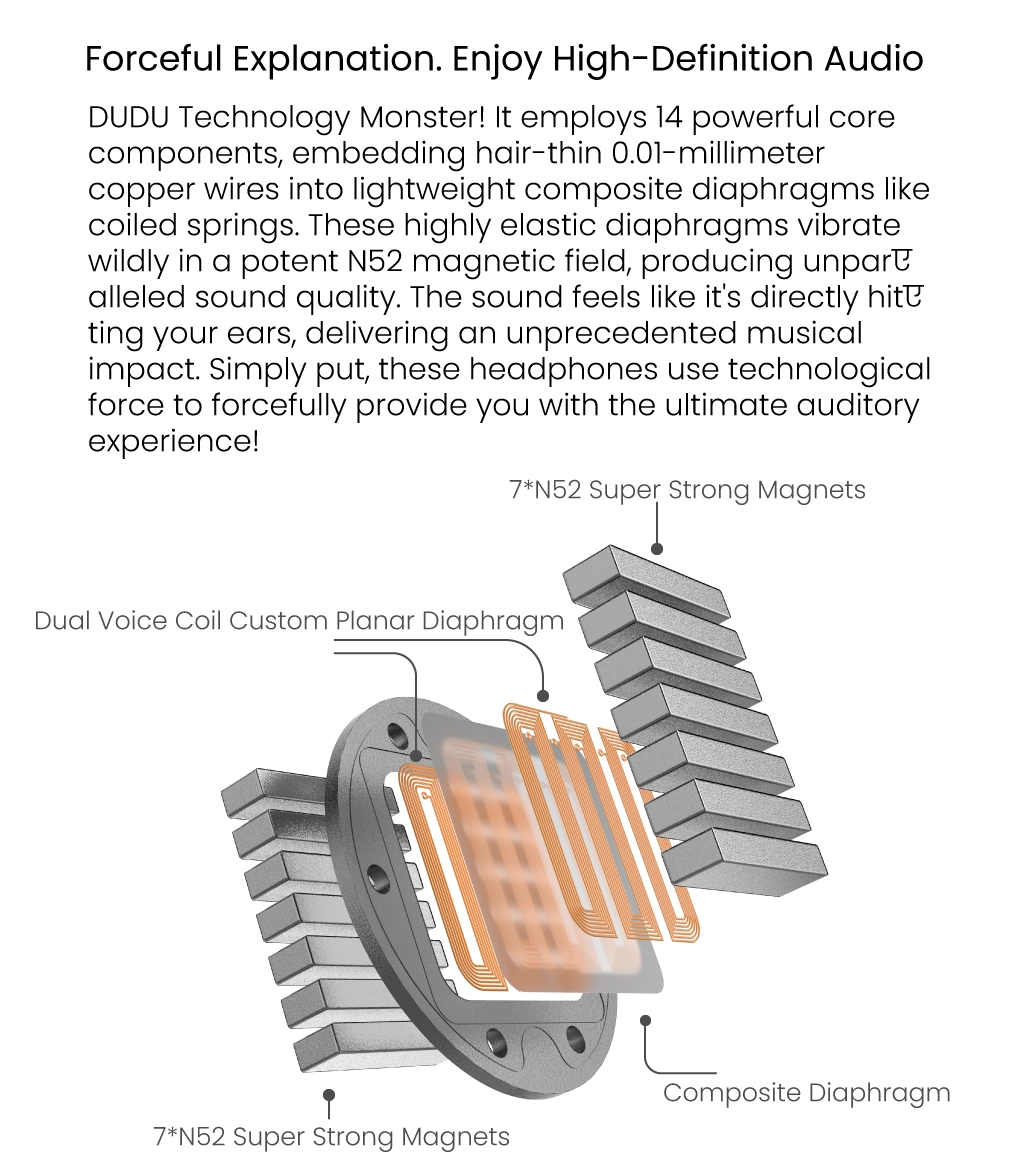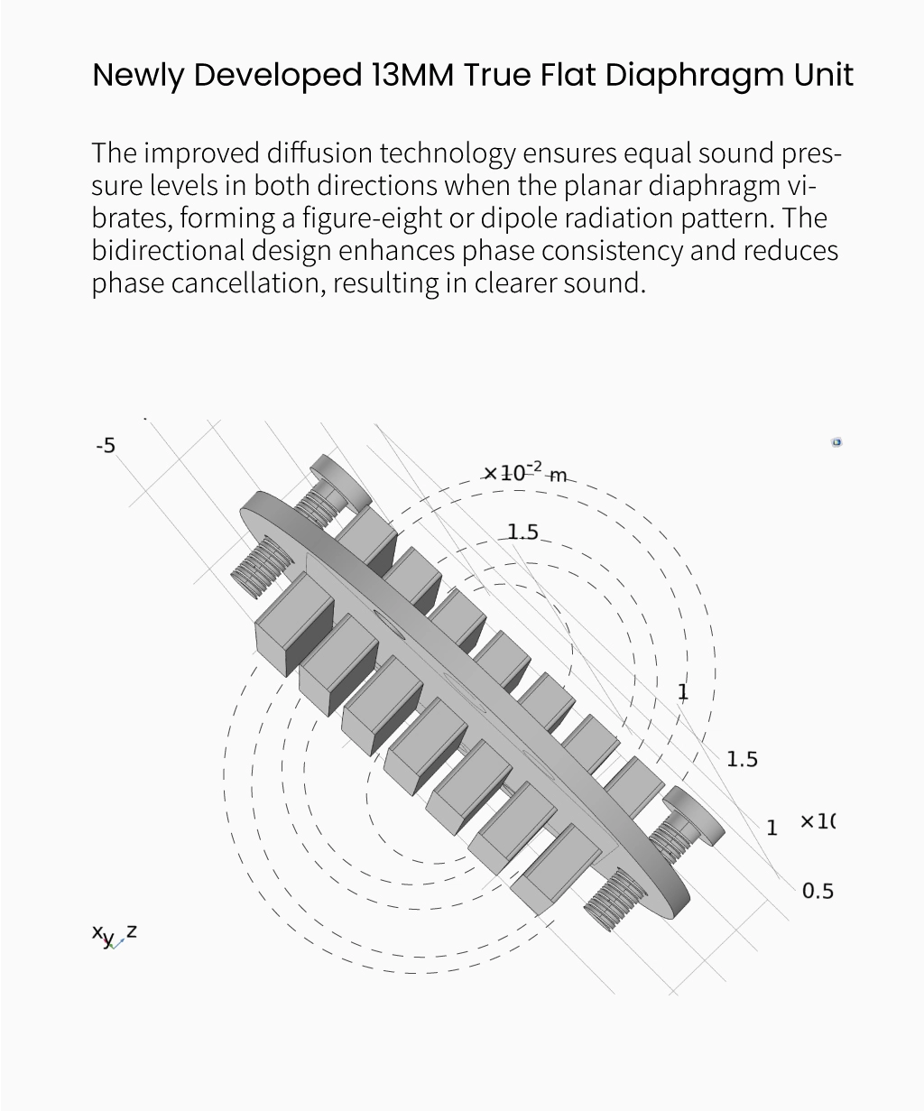 TINHIFI DUDU sử dụng driver planar 13mm với màng phẳng thực thụ tiên tiến. Công nghệ khuếch tán cải tiến giúp áp suất âm thanh phân bố đều theo hai hướng, từ đó mang lại âm thanh rõ ràng hơn, cải thiện độ đồng pha và giảm hiện tượng triệt tiêu pha.